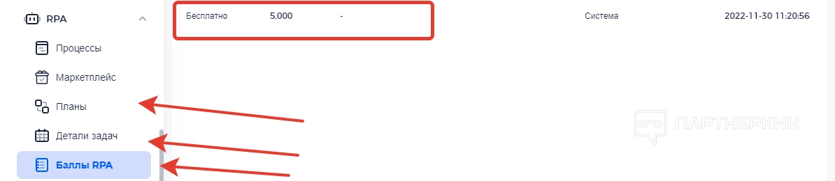 Во вкладке « Планы » отображаются детали по запланированным действиям. «Детали задач» содержат информацию, которая описывает последовательность автоматизированных действий. Что касается вкладки « Баллы RPA », в ней отображается количество баллов, за которые в маркетплейсе приобретаются шаблоны.