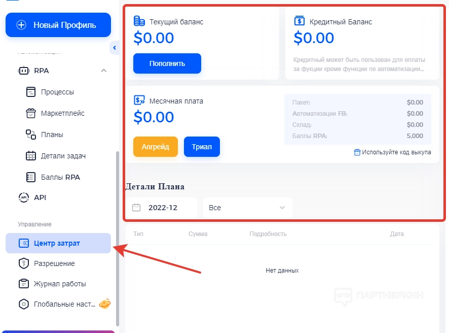 Ниже можно найти вкладку « Центр затрат ». Там отображается текущий и кредитный баланс, а также вся информация, касающаяся финансовых манипуляций. Там же можно найти количество имеющихся баллов RPA, профилей и историю транзакций.