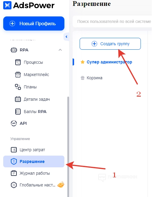 Во вкладке «Разрешения» можно выдавать права доступа другим пользователям. Для этого нужно перейти во вкладку, выбрать « Создать группу » и дать разрешение на те или иные действия.