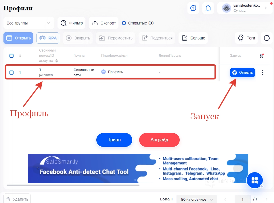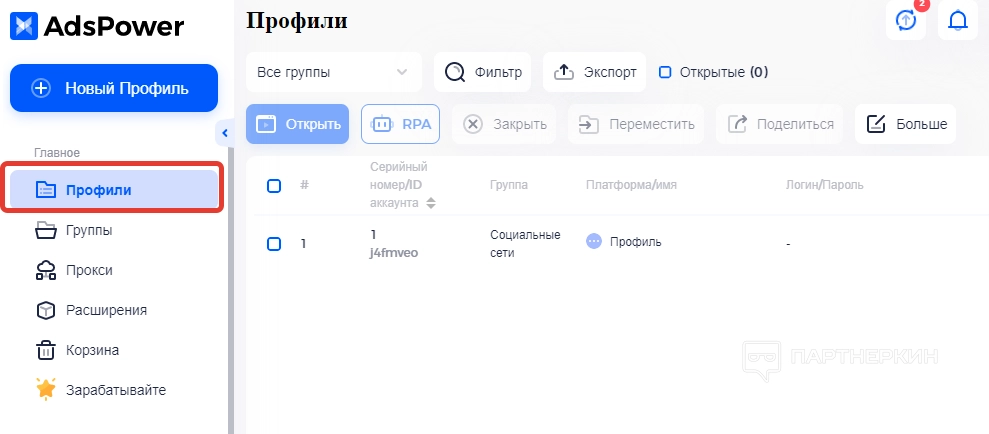 Все, после выполненных действий созданный профиль отобразится в рабочем окне. Чтобы приступить к работе с помощью этого профиля, жмем на кнопку «Открыть» в правой части экрана и ждем, пока загрузится