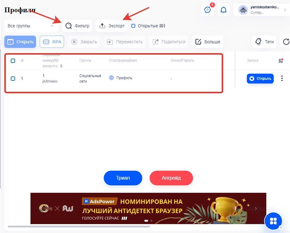В первую очередь обратим внимание на центральную часть рабочего экрана. Здесь будут отображаться все созданные профили, которые можно сортировать по группам, серийным номерам и имени. Для более удобного поиска есть фильтрационная система, разделяющая аканты по ID, тегам, заметкам, IP, странам и так далее. Рядом с фильтром предусмотрен инструмент для экспорта данных из профилей.