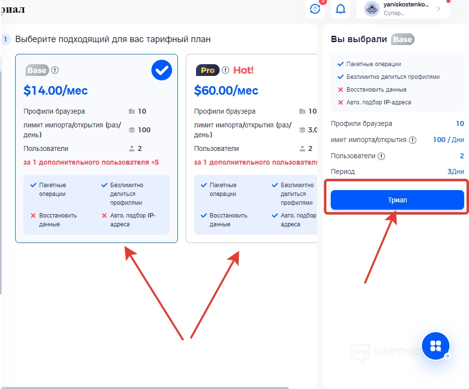 В нижней части экрана есть рекламный блок, над которым отображены кнопки « Триал » и « Апгрейд ». При нажатии на « Триал » перед пользователем откроется окно, в котором можно выбрать пробный период для каждого тарифного плана. Для изучения функциональных особенностей любого тарифа предоставляется по 3 дня. Чтобы запустить тестовый период, выбираем пакет услуг и жмем на кнопку « Триал ».