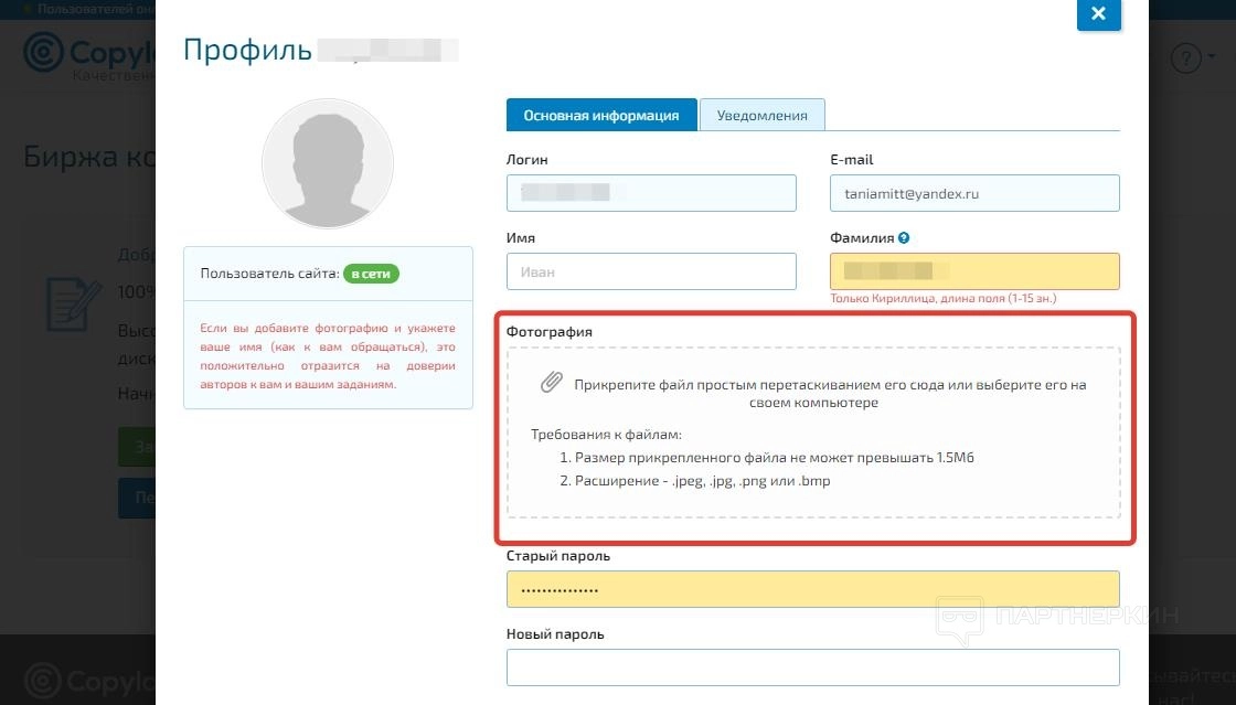 В отличие от копирайтеров, заказчики не обязаны устанавливать фотографию, но это рекомендуется как способ повышения доверия со стороны авторов и системы. Чтобы загрузить снимок, щелкните курсором по соответствующему полю и найдите фото на ПК.