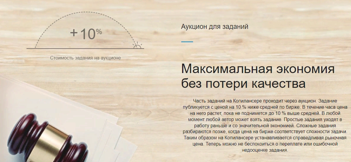 Такой принцип помогает с экономией приобрести простые тексты, так как обычно их разбирают начинающие авторы. В то же время сложные задачи со временем растут в цене и отходят наиболее опытным исполнителям, что обеспечивает их качественное исполнение. Таким образом заказчик может не беспокоиться о том, что установил неверную цену, т.к. стоимость выравнивается самостоятельно.