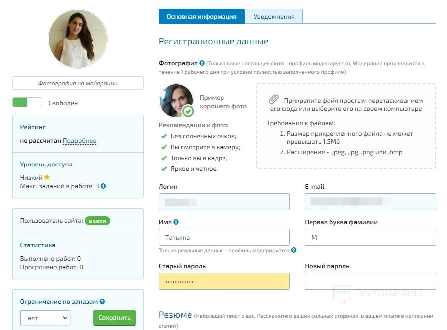 - Статус – свободен или занят. Не забывайте изменять этот параметр, чтобы во время работы вам не добавляли новые задания – это может негативно отразиться на рейтинге. Чтобы переключать статус, кликните по тумблеру под аватаркой.