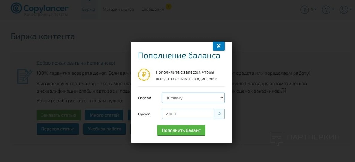 Заказчики могут пополнить личный счет через платежную систему Paymore или безналичным расчетом. Во втором случае минимальная сумма внесения – 10 000 рублей. При пополнении счета взимается комиссия размером в 10%. Следует учитывать, что на платформе не осуществляется обратный возврат на наличный счет.