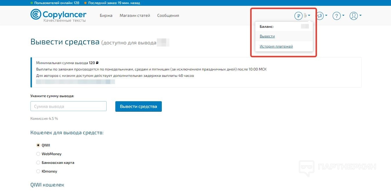 Укажите сумму в соответствующем поле. На сайте есть минимальный порог вывода – не менее 120 рублей. Введите номер кошелька или карты и нажмите «Вывести средства». Обратите внимание, что самая первая выплата на сайте проходит проверку в течение 48 часов.
