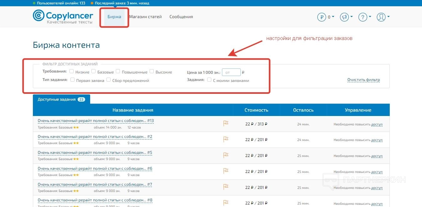 Задания располагаются в разделе «Биржа». По умолчанию выводится список всех выставленных на сайте задач, но не все их можно взять в работу. Если ваш доступ не соответствует условиям заказа, возле него будет указана соответствующая пометка.