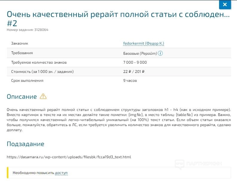 Чтобы открыть карточку заказа, нужно кликнуть по его названию. В окне информации можно узнать логин заказчика, тип задания (рерайт или копирайт, наполнение сайта и т.д.), требуемое количество знаков, требования, стоимость и срок выполнения.
