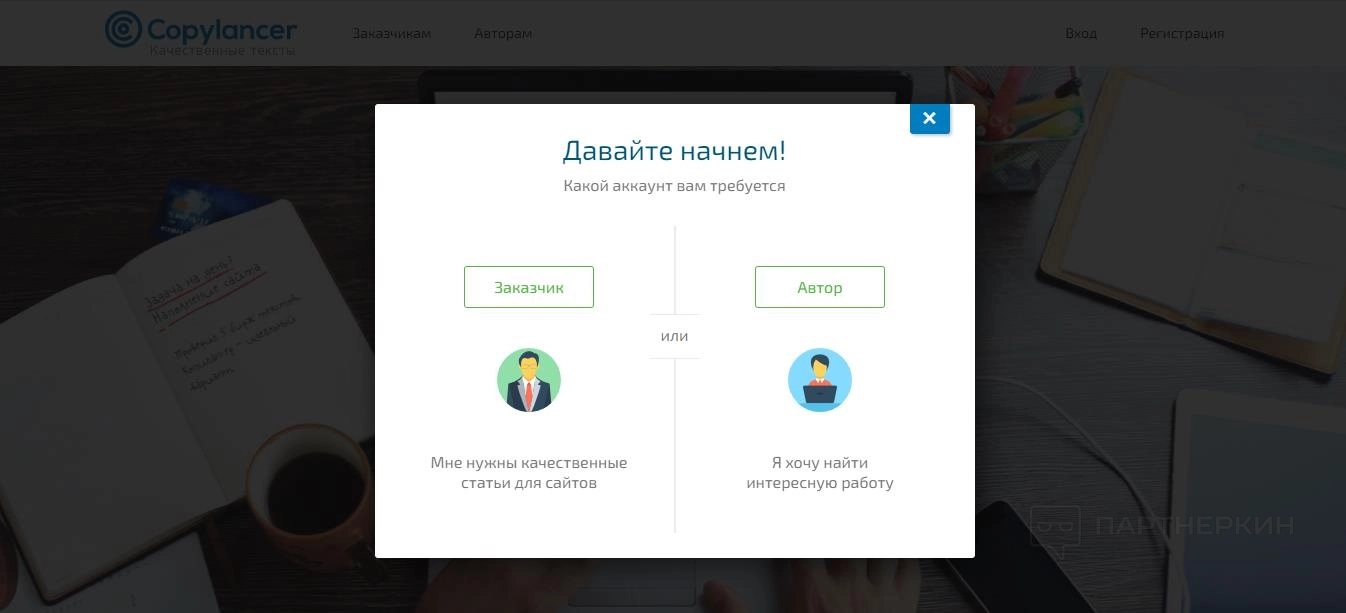 Рассмотрим, как работать на платформе в качестве заказчика статей и автора. Для старта нужно нажать кнопку «Регистрация» в правом верхнем углу и выбрать, как именно вы намереваетесь использовать систему.