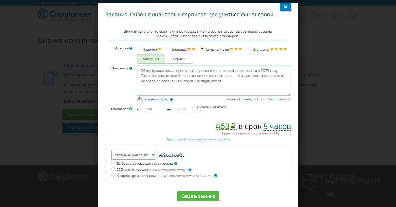 - Базовый доступ. Копирайтеров с этим уровнем часто нанимают для написания SEO-статей с ключевыми словами, заточенными под поисковые системы. Согласно информации на сайте, стоимость 1000 знаков составляет ₽32, в месяц можно заработать до ₽5000.