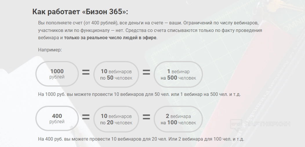 Обязательный минимальный платеж составляет 400 рублей. Денежные средства списываются в режиме реального времени по факту совершаемых действий – запуск вебинаров, подключение пользователей к эфиру и т.д.