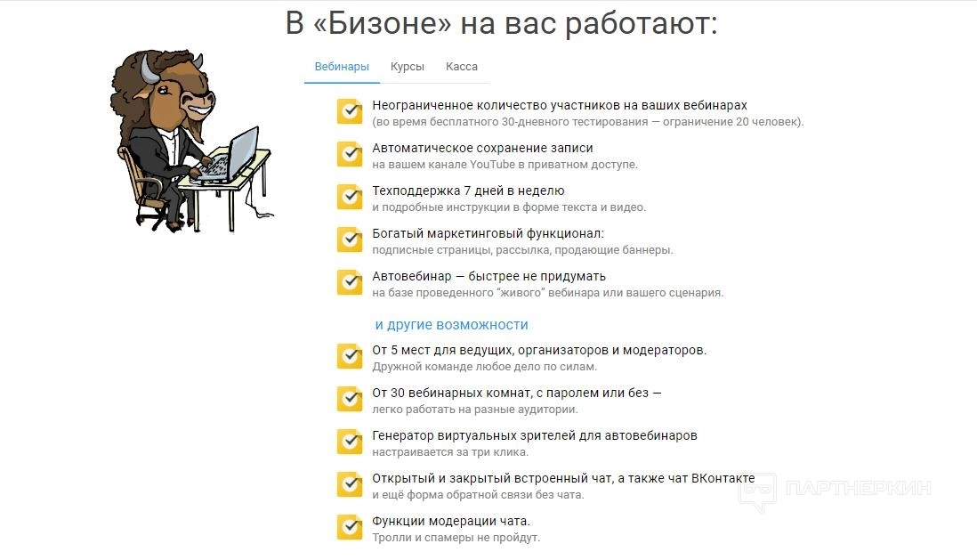 позволяет подключать к создаваемым проектам онлайн-кассу для мгновенного получения оплаты за доступ к вебинарам или урокам. Таким образом ученики могут получить автоматический доступ к учебному кабинету после внесения оплаты. Это значительно сокращает время на ведение бизнеса, так как облегчает такие рутинные действия, как связь с клиентом для выдачи пароля.