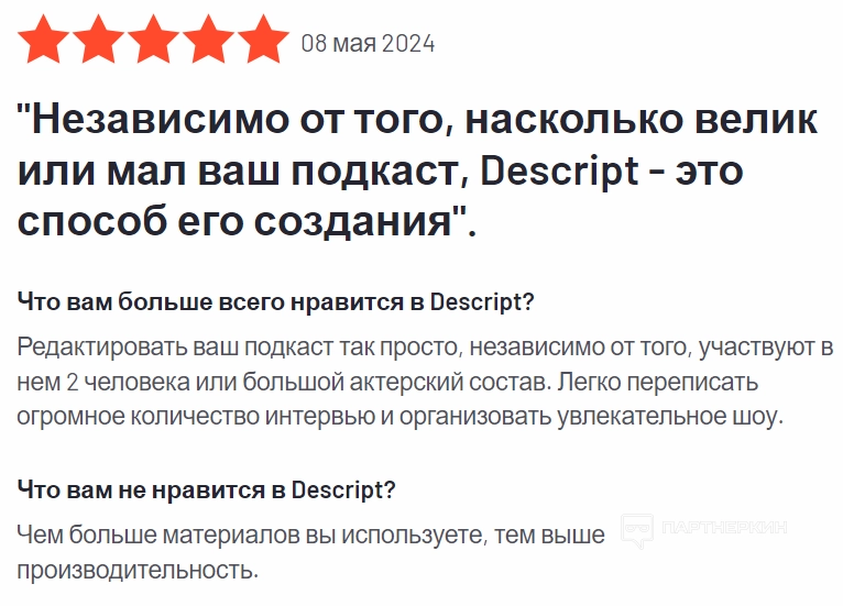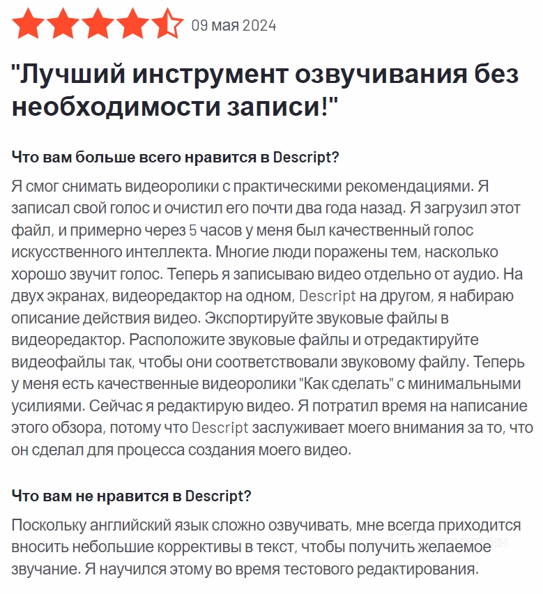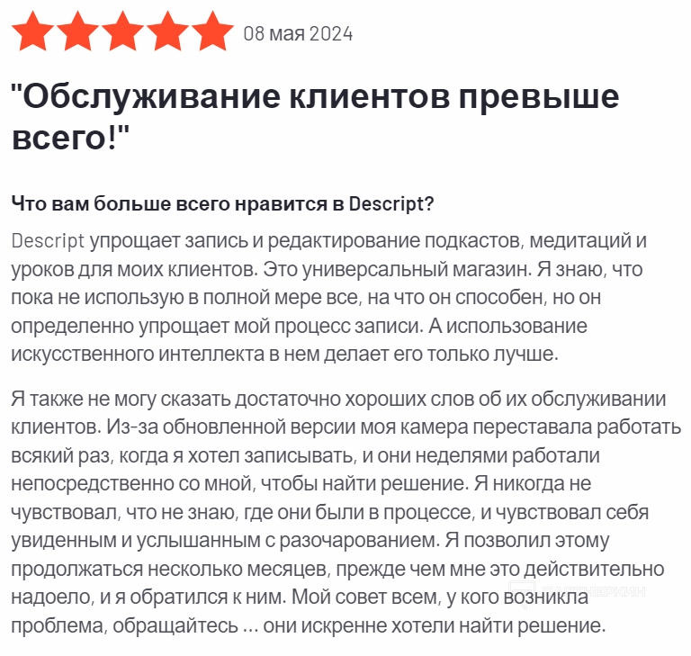 — мощный инструмент для создания и редактирования мультимедийного контента. Пользователи высоко оценивают его за удобство, скорость обработки и качественные AI-голоса. Отличная поддержка и интуитивный интерфейс делают Descript идеальным выбором для профессионалов и начинающих контент-мейкеров.