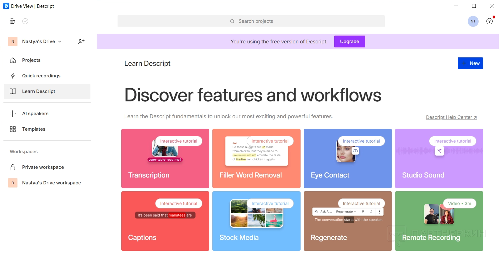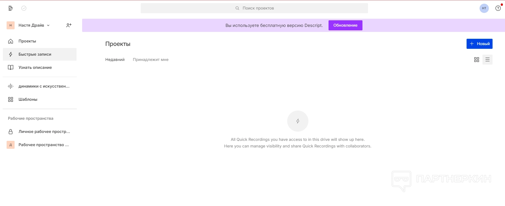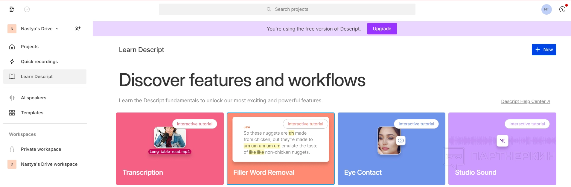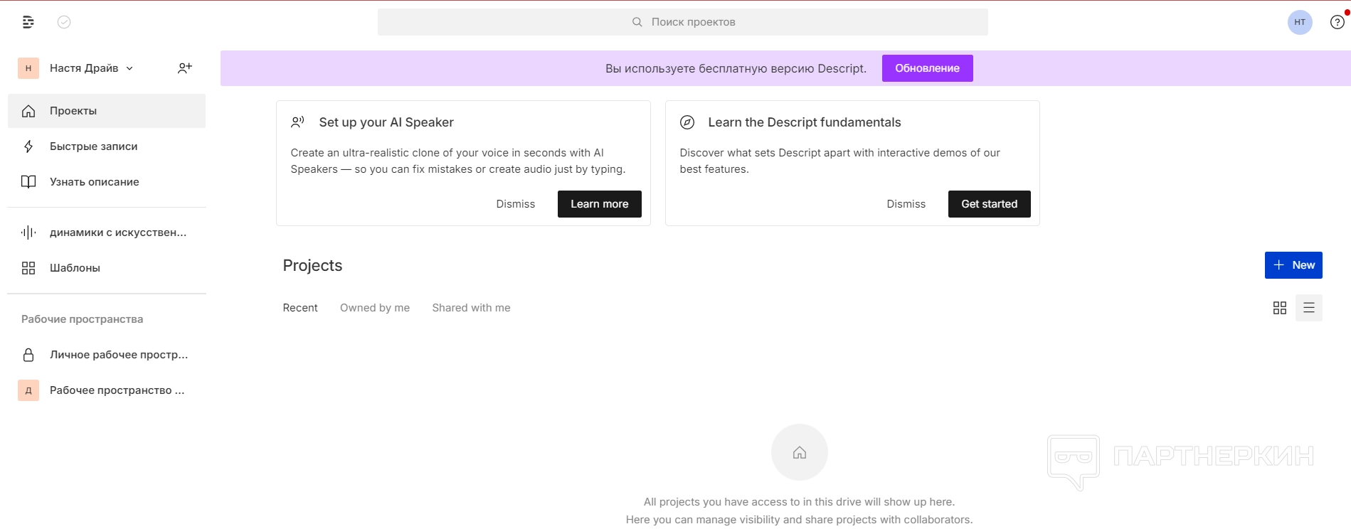 создан для максимального удобства и эффективности, позволяя пользователям быстро ориентироваться и использовать все доступные функции. Давайте подробно рассмотрим рабочее пространство Descript, которое включает семь основных разделов: проекты, быстрая запись, изучение Descript, спикеры ИИ, шаблоны, личное рабочее пространство и рабочее пространство пользователя.