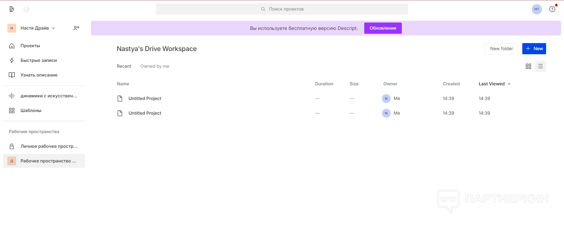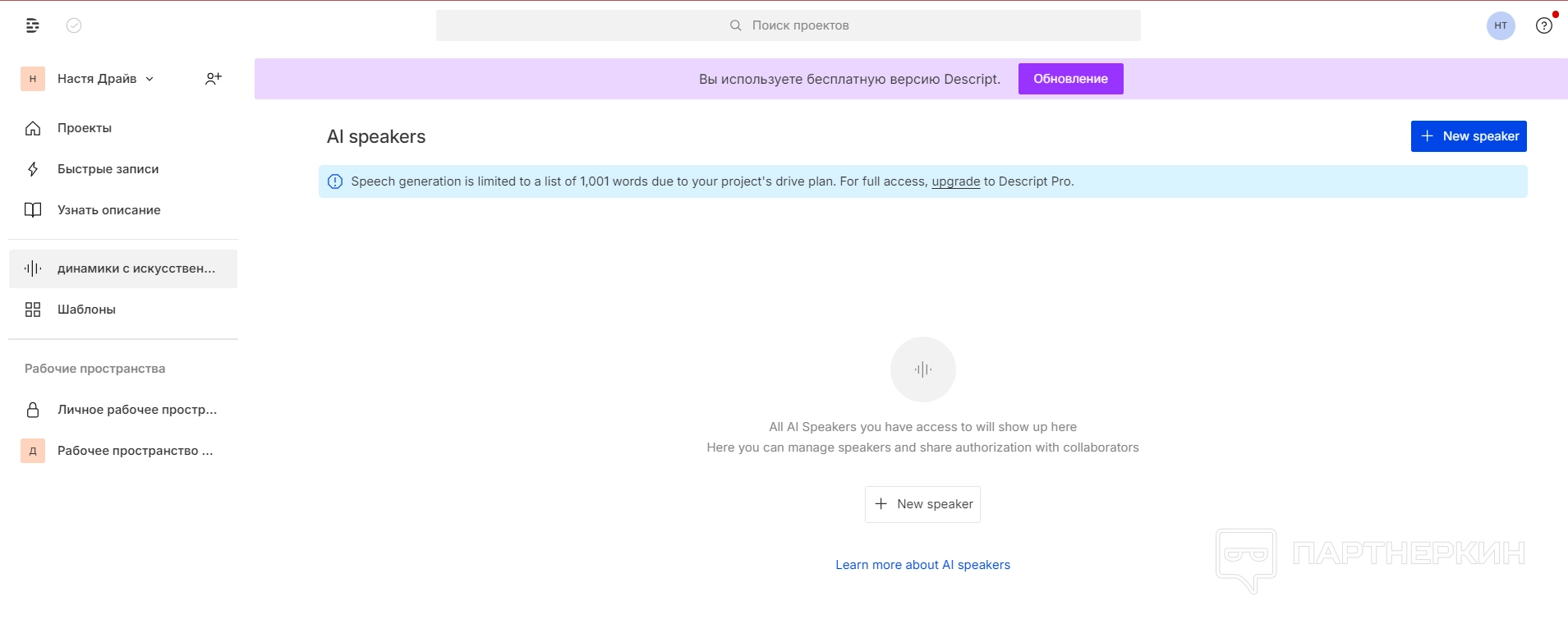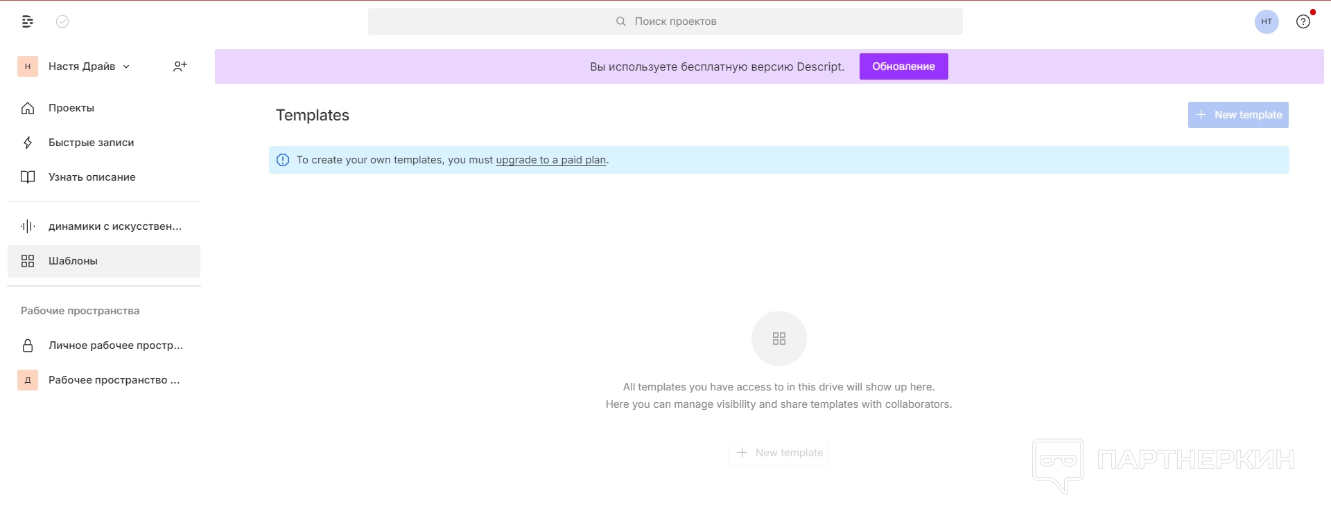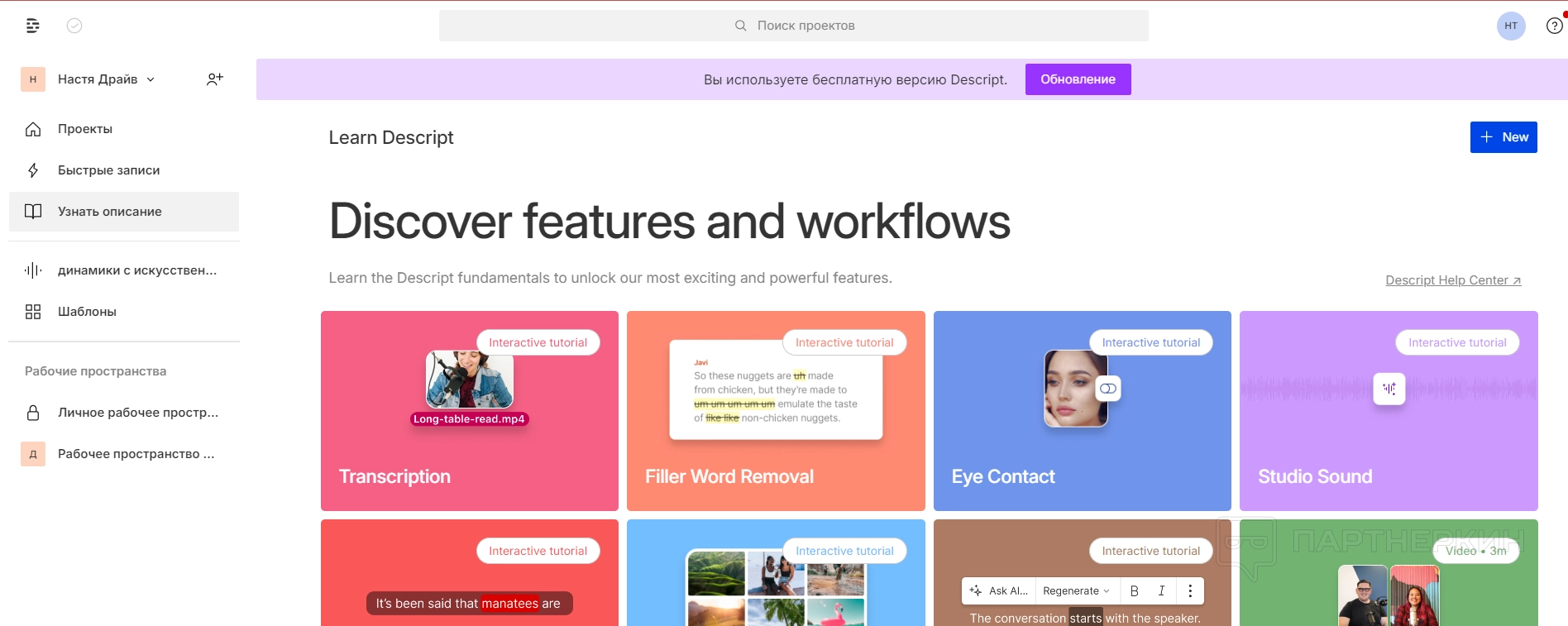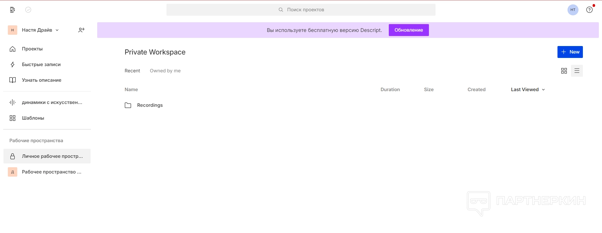создан для максимального удобства и эффективности, позволяя пользователям быстро ориентироваться и использовать все доступные функции. Давайте подробно рассмотрим рабочее пространство Descript, которое включает семь основных разделов: проекты, быстрая запись, изучение Descript, спикеры ИИ, шаблоны, личное рабочее пространство и рабочее пространство пользователя.