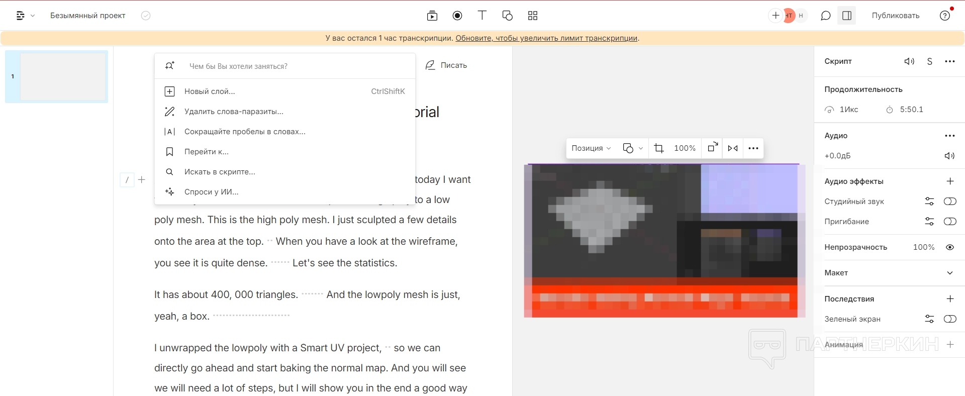 , вы можете использовать разнообразные инструменты для его редактирования. Например, если ваш видеоматериал содержит слова-паразиты или ненужные паузы, вы можете воспользоваться функцией их автоматического удаления. Эта функция особенно полезна для подкастов и интервью, где важна чистота речи и профессиональное звучание.