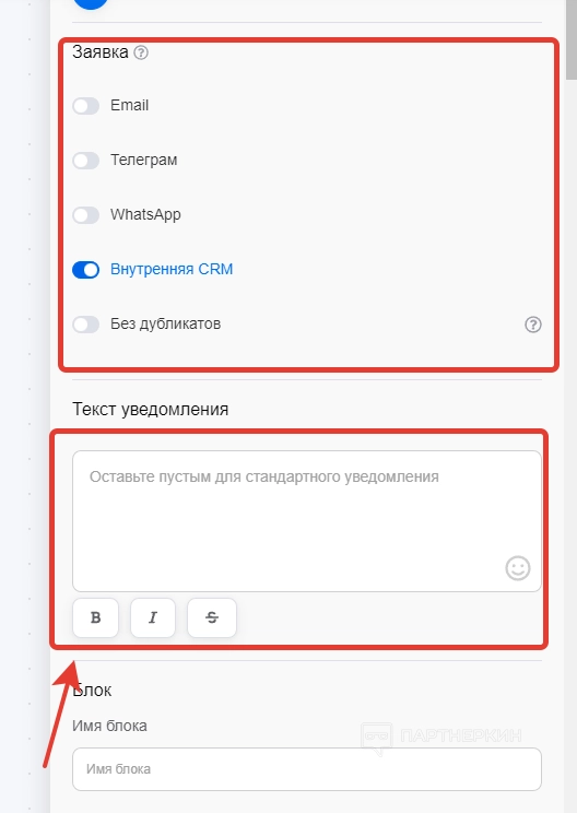 В блоке «Старт» нам нужно всего лишь указать имя. В блоке «Заявка» придется прописать текст уведомления, которое будет приходить пользователям, и выбрать способ рассылки: