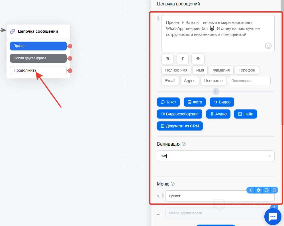 Следующий этап — создать цепочку сообщений, разработав разные варианты ответов. Когда пользователь нажмет на кнопку «Продолжить», в правой части экрана отобразится форма, где есть текстовый редактор, инструменты для добавления медиафайлов и меню, где будут создаваться варианты ответов.