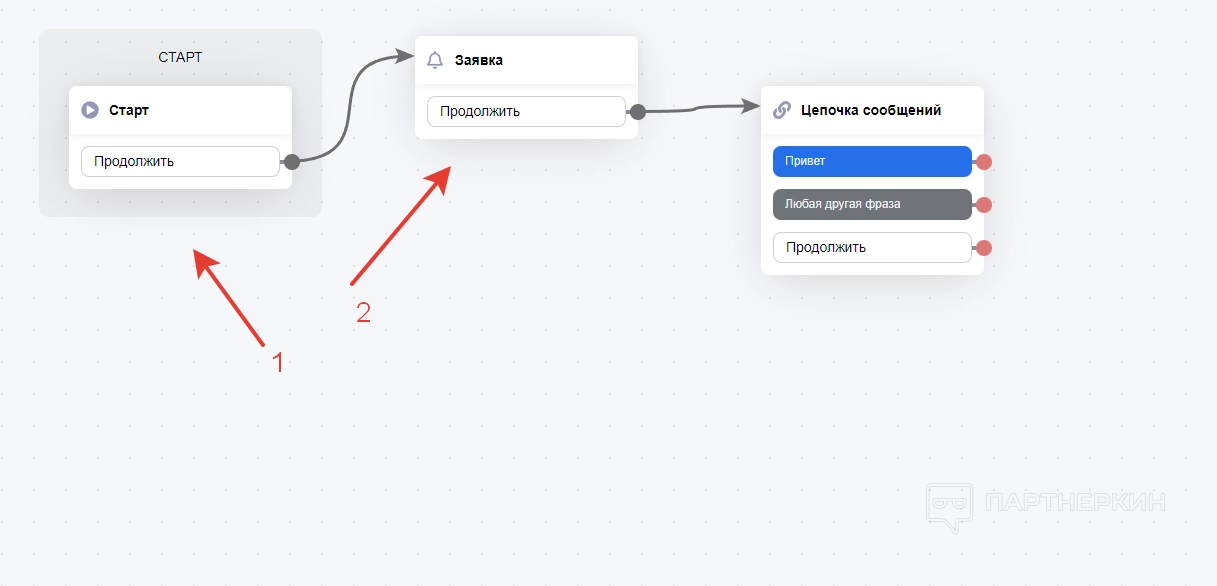 На следующем этапе пользователю нужно прописать сценарий, в соответствии с которым будет работать чат-бот. В первую очередь заполняем блоки «Старт» и «Заявка».