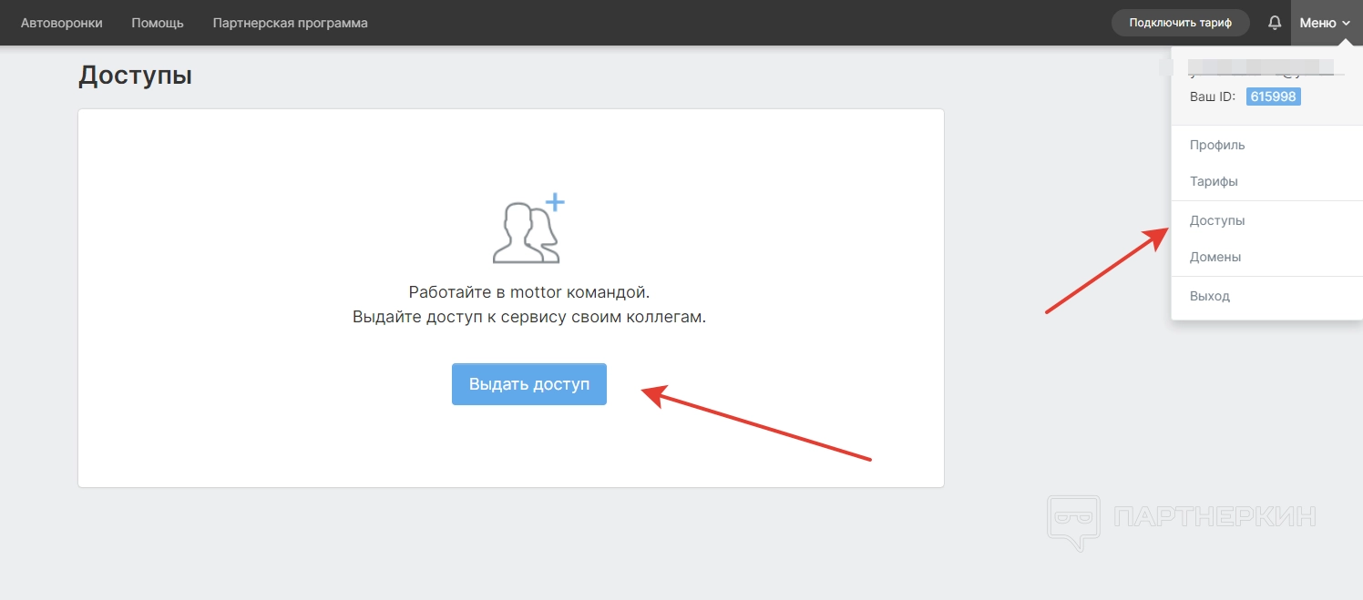 Также в разделе настроек можно выдать доступ к учетной записи другим пользователям. Для этого вызываем контекстное меню и выбираем блок «Доступы». Далее пользователю нужно нажать на «Выдать доступ».