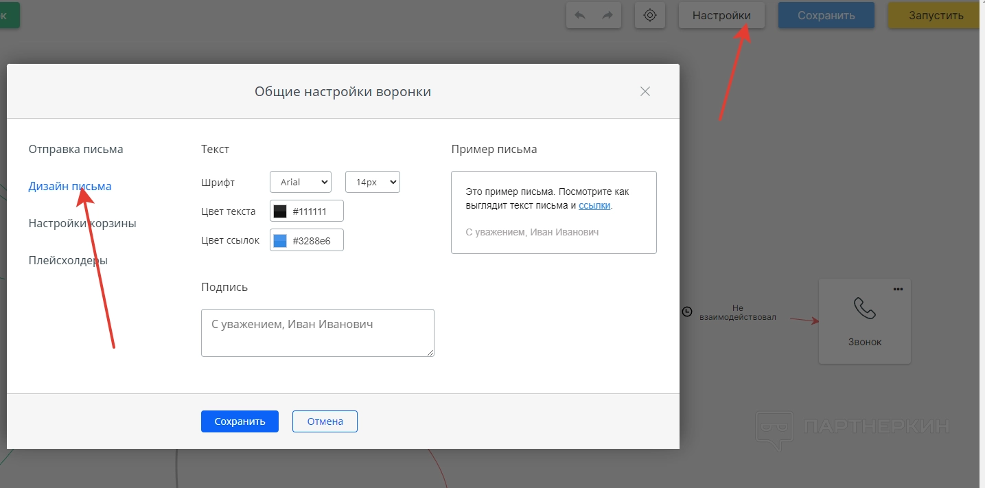 Также есть возможность настроить дизайн письма. Для этого жмем на раздел «Настройки» и выбираем соответствующую вкладку. Там можно изменить шрифт, цвет текста и ссылок, а также поставить подпись.