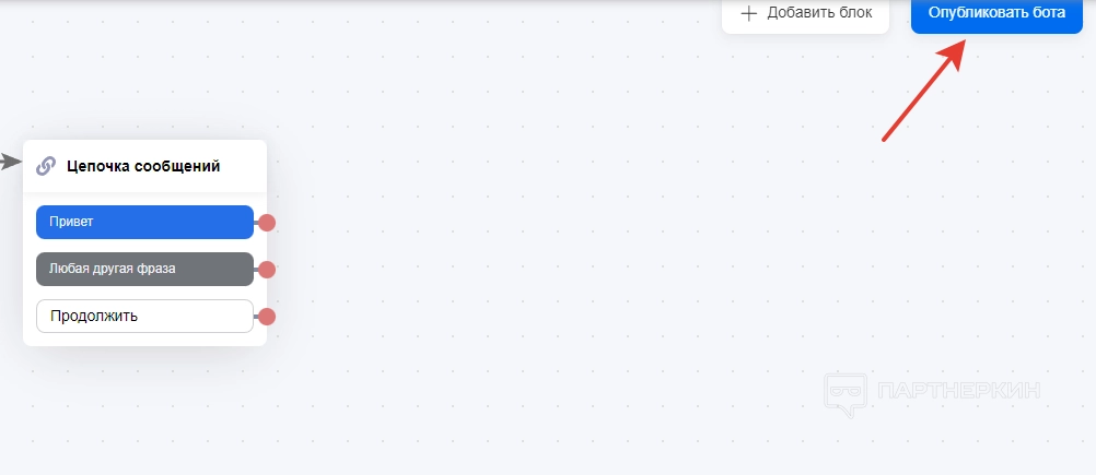 Когда чат-бот будет готов, кликаем на кнопку «Опубликовать бота», которая расположена в правом верхнем углу.