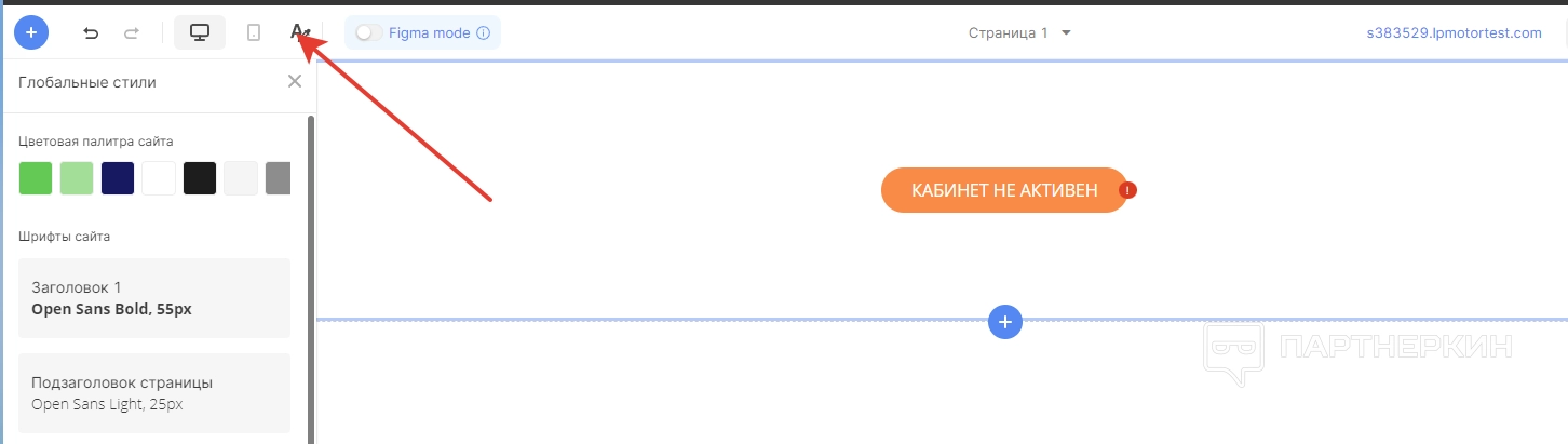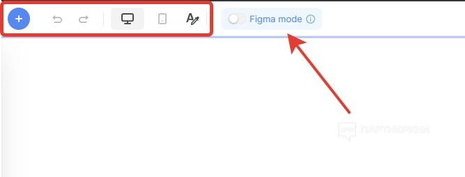 Редактор сайта состоит из основной рабочей зоны, где добавляются, отображаются и настраиваются блоки, и панели управления. С помощью панели управления пользователь может добавить блок, отменить действие, адаптировать сайт под desktop/mobile и настроить шрифты. Также есть кнопка для запуска режима Figma, который позволит более углубленно прорабатывать дизайн.