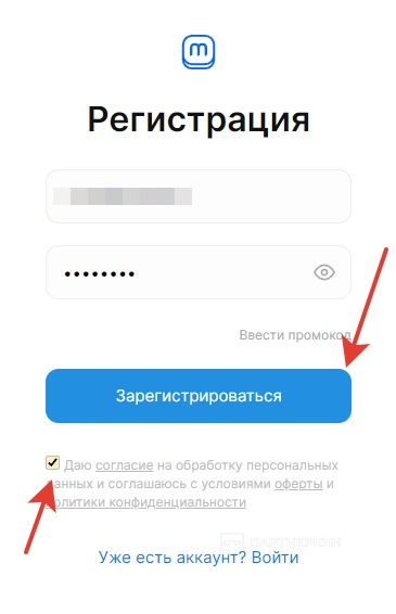 Регистрация проходит быстро: нужно всего лишь указать номер телефона и пароль. Когда данные будут введены, даем согласие на обработку персональных данных и жмем на кнопку «Зарегистрироваться».