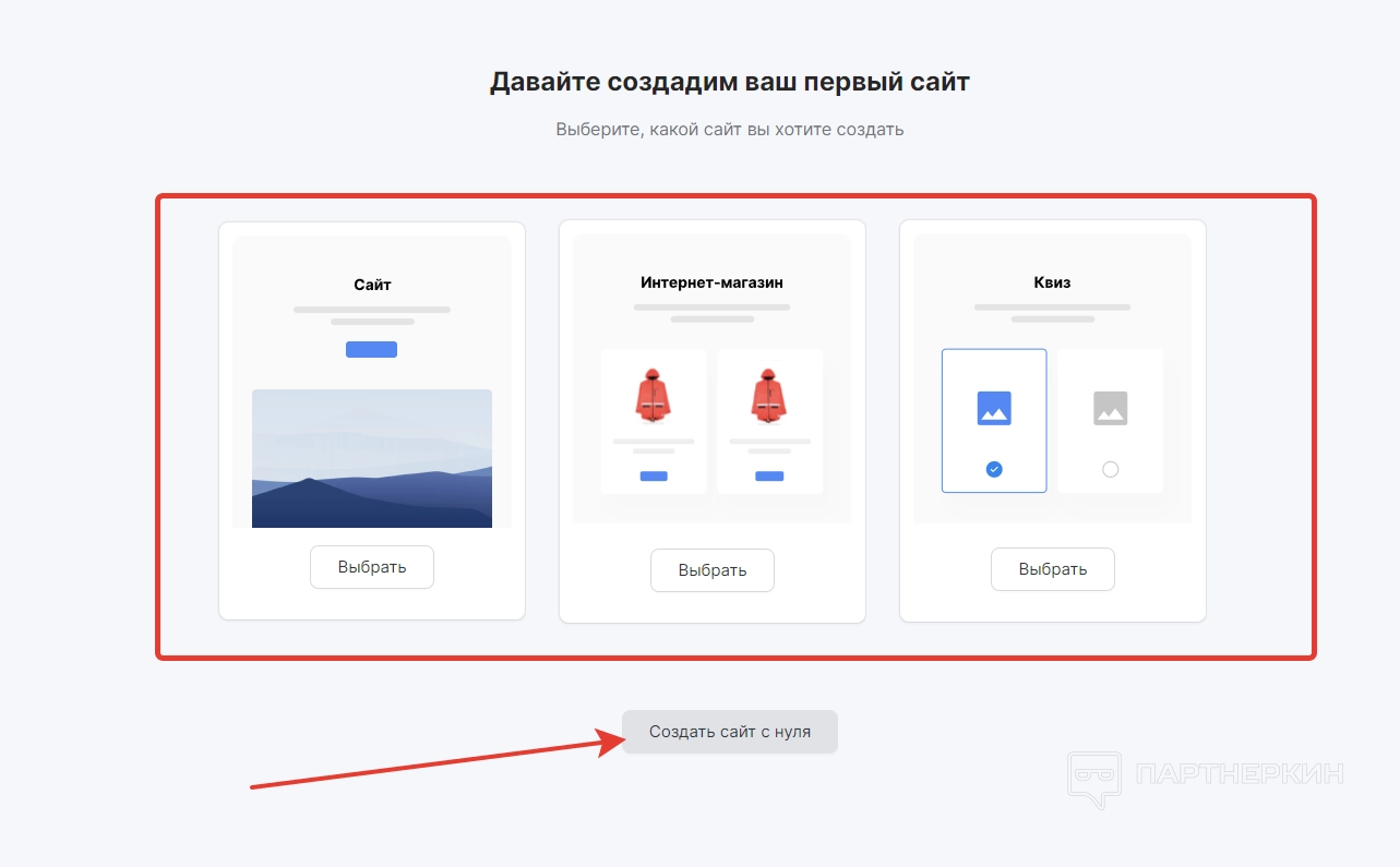 После регистрации учетной записи пользователь должен выбрать тип сайта, который он намерен создать. На момент написания статьи были доступные такие вариант, как сайт, интернет-магазин и квиз. Если ни один из вариантов не подходит, можно создать веб-сайт с нуля. Для этого кликаем на соответствующую кнопку в нижней части экрана.