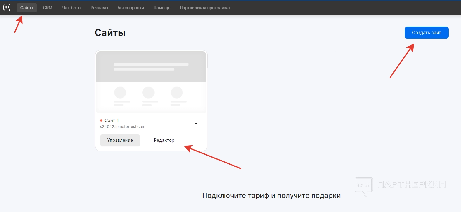 Работу с сервисом следует начинать в главном меню. Перейдя в раздел «Сайты», пользователь увидит список веб-ресурсов, созданных в рамках своего аккаунта. По умолчанию система отобразит сайт, который настраивался на момент регистрации учетной записи.