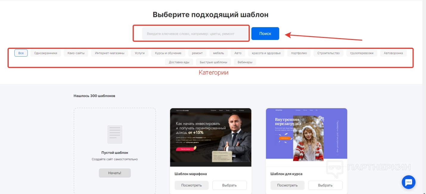 В общей сложности для разработки сайтов есть свыше 300 шаблонов. Также отдельно присутствуют макеты для чат-ботов и автоворонок. Обращаем внимание на поисковую строку, с помощью которой можно искать шаблоны по названию.