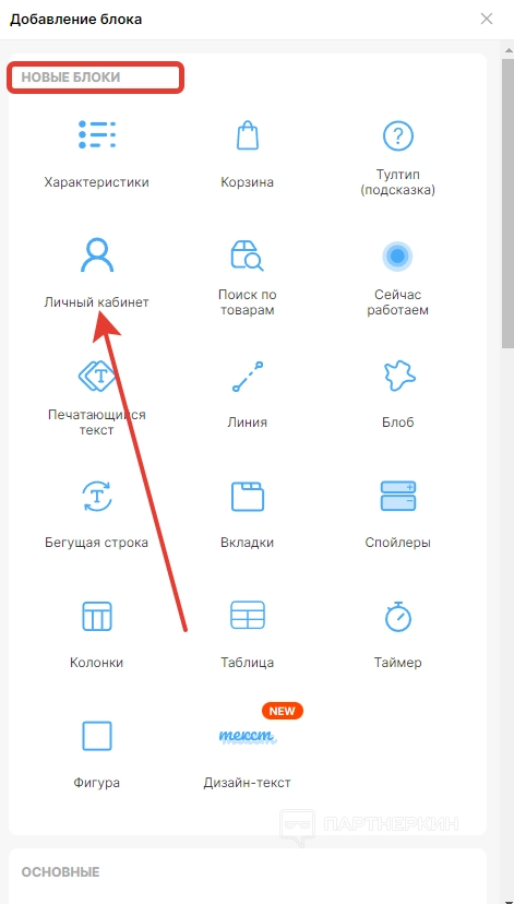 Выбираем, например, блок «Личный кабинет» из категории «Новые блоки». Для этого зажимаем левой кнопкой мышки выбранный блок и просто перетаскиваем его в редактор.