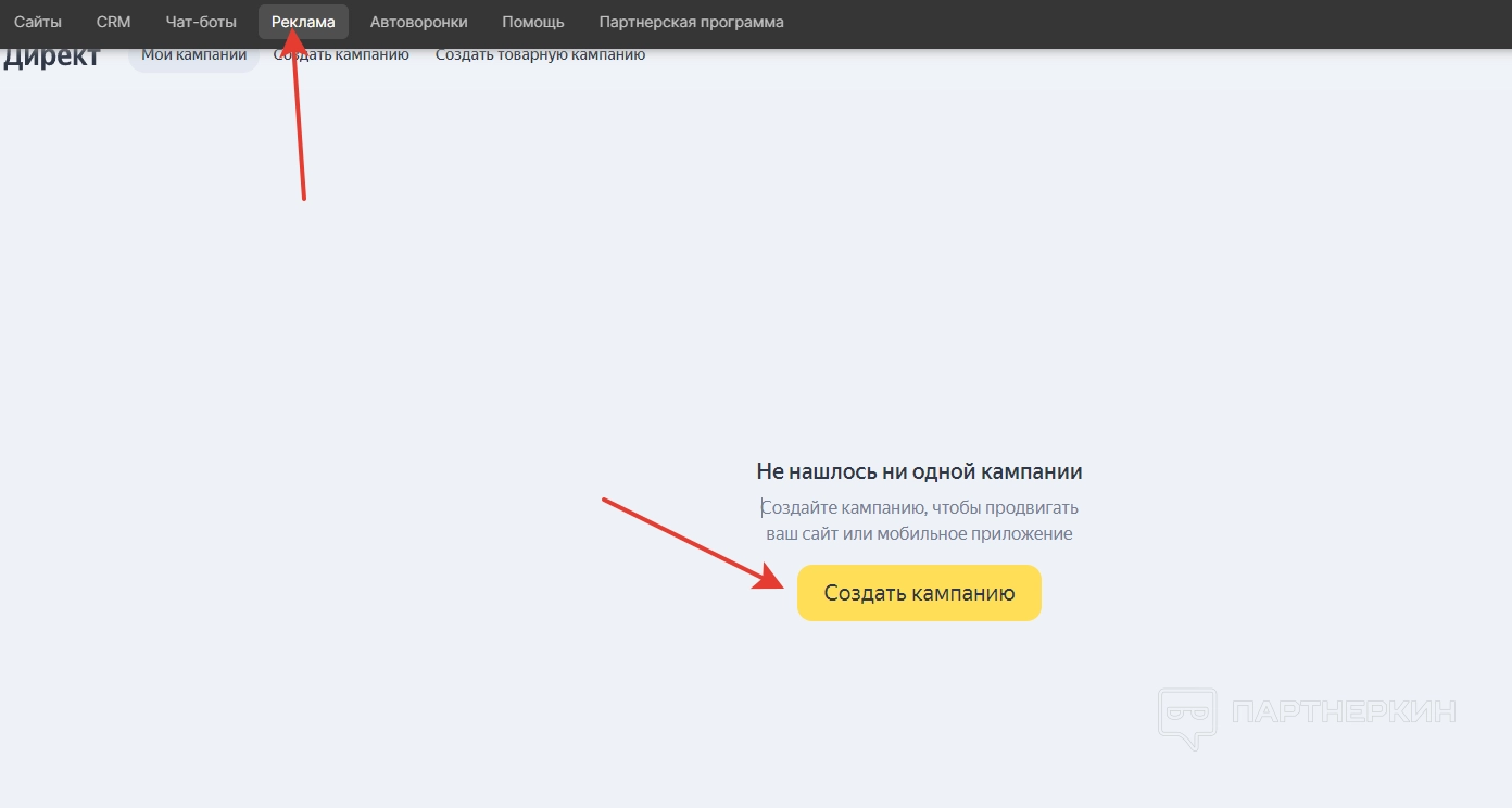 В разделе «Реклама» пользователь может создавать рекламные кампании. Перейдя в соответствующий блок и кликнув на желтую кнопку в центре экрана, владелец аккаунта откроет форму, где нужно будет указать некоторые сведения для продвижения веб-ресурса.