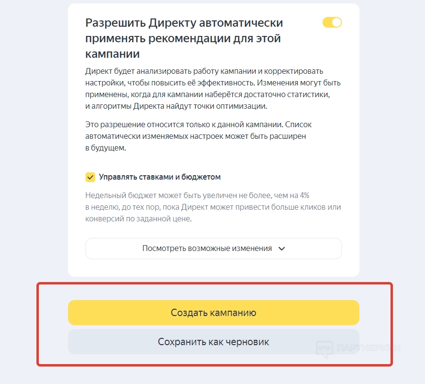 - даем разрешение директу на автоматическое применение рекомендаций по улучшению рекламной кампании.