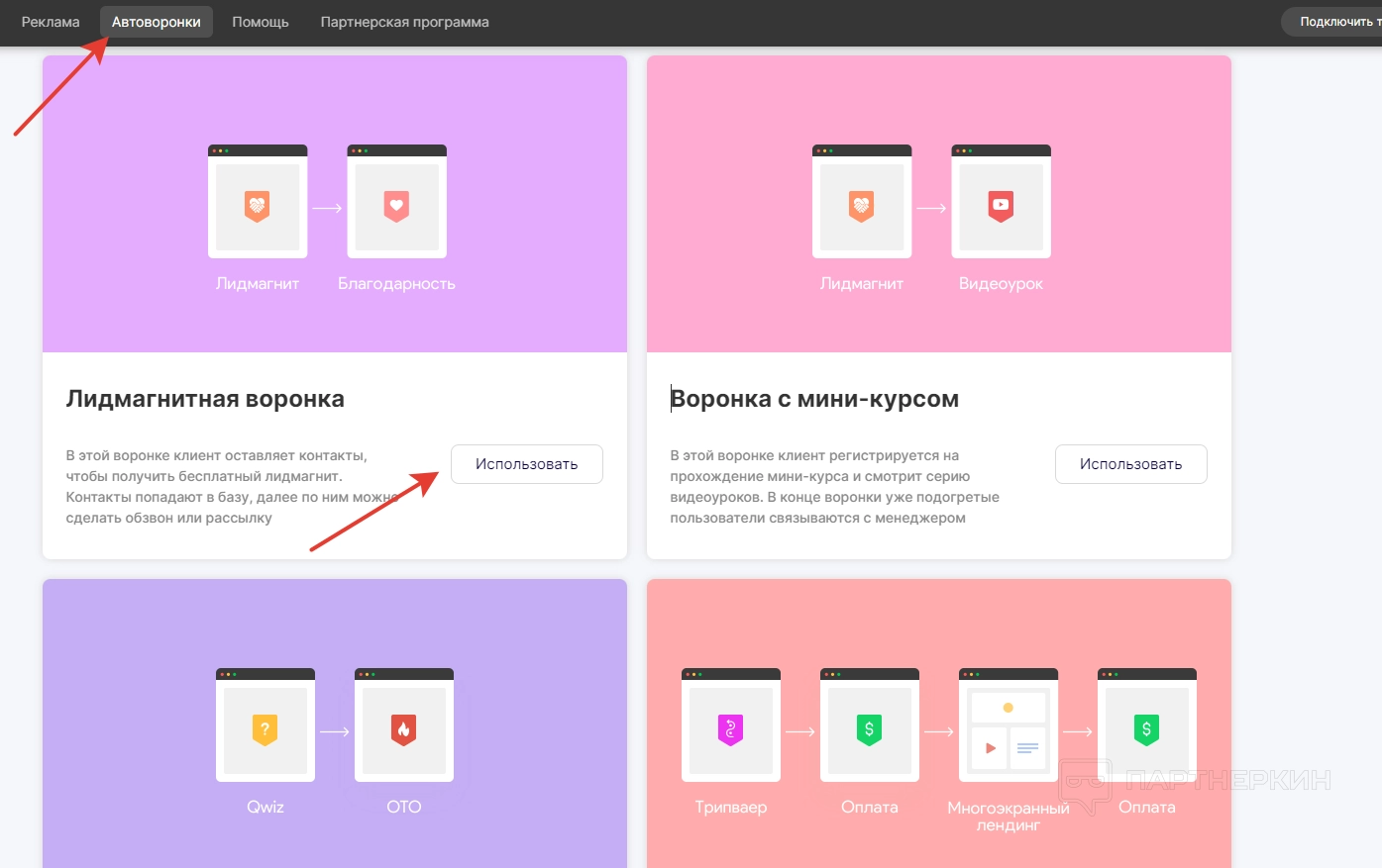 - Лидмагнитная воронка. В ней клиенты оставляют свои контакты.
