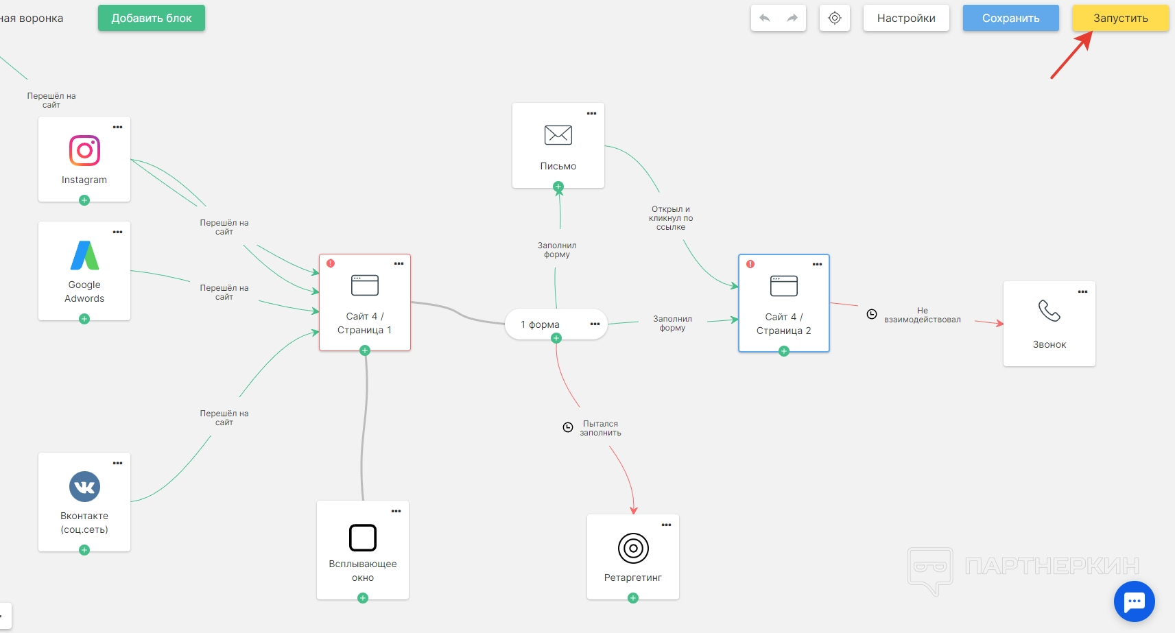 На новой странице отобразиться карта, в соответствии с которой будет работать воронка. Пользователю надо лишь написать письмо, вставить ссылки на страницы сайта с продуктом и указать прочие параметры. По готовности жмем на кнопку «Запустить».