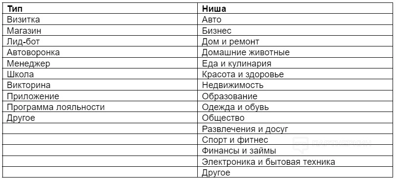 После этого выбираем тип бота и нишу, в которой он должен работать: