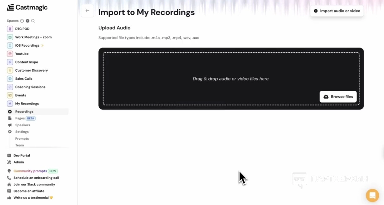 - Импорт. Синхронизация с загрузкой файлов, ссылкой на youtube/vimeo, RSS-каналом, Reels, Zapier, Zoom, Drive и многим другим.