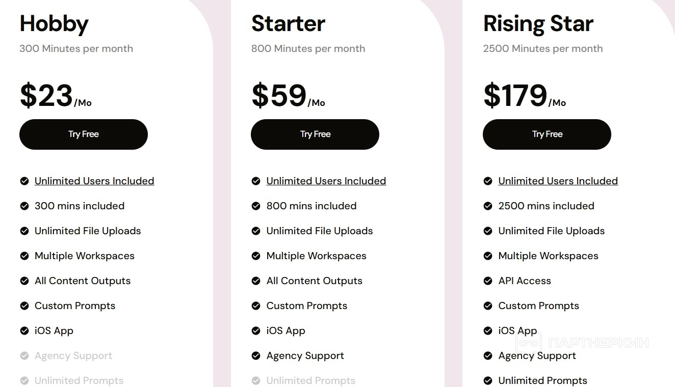 - Тариф Хобби стоит $23 / мес. При оплате подписки на год доступны скидки. Тариф за $23 включает 300 минут в месяц, неограниченное количество пользователей и загрузок файлов.