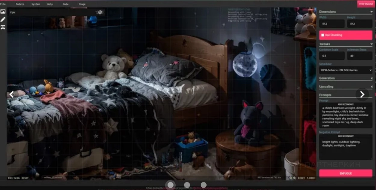 Представляет собой новую концепцию, где основное внимание уделено изображению, а не вводу данных. В отличие от других веб-интерфейсов, где 95% экрана занимают входные данные, у Enfugue это соотношение обратное. Здесь нет режимов работы или вкладок. Пользователи могут свободно переключаться между инпейнтингом, Controlnet, увеличением разрешения и другими функциями.
