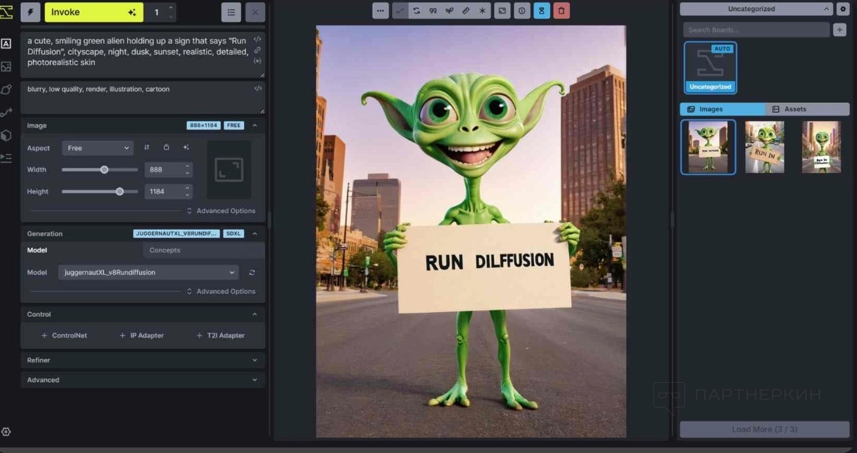 Представляет собой набор инструментов для выполнения операций по инпейнтингу и аутпейнтингу. ПО дает возможность создавать уникальные рабочие процессы с помощью узлового движка Invoke или генераций потрясающих изображений с использованием Controlnet Adapters.