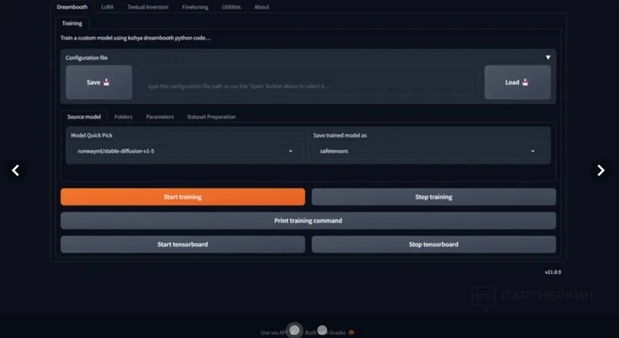 Этот интерфейс позволяет устанавливать параметры обучения. Также создавать и запускать необходимые команды CLI для тренировки моделей.