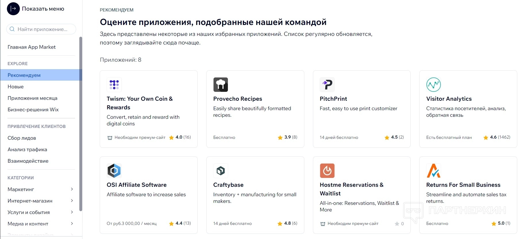 - Wix App Market . Магазин приложений, где можно купить или взять бесплатно приложение для сайта, которое увеличит его функционал.