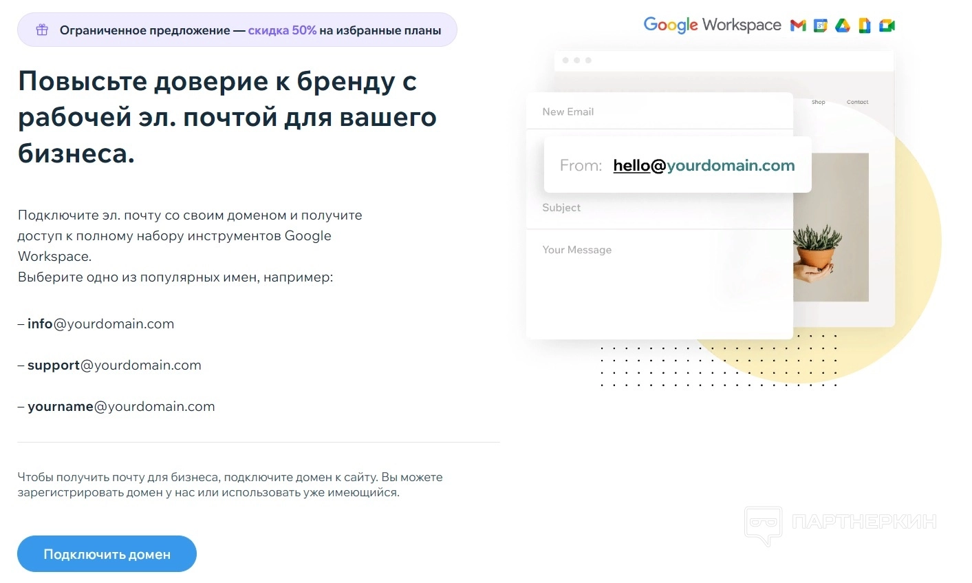 В комплекте с доменом предлагается электронная почта, можно создать корпоративный адрес.