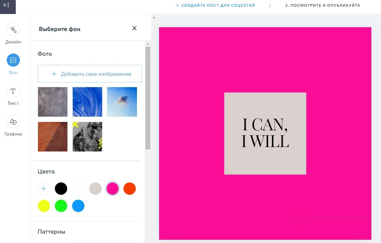 - Перейти в редактор , изменить дизайн. Можно добавить текст, галереи, видео, векторную графику.