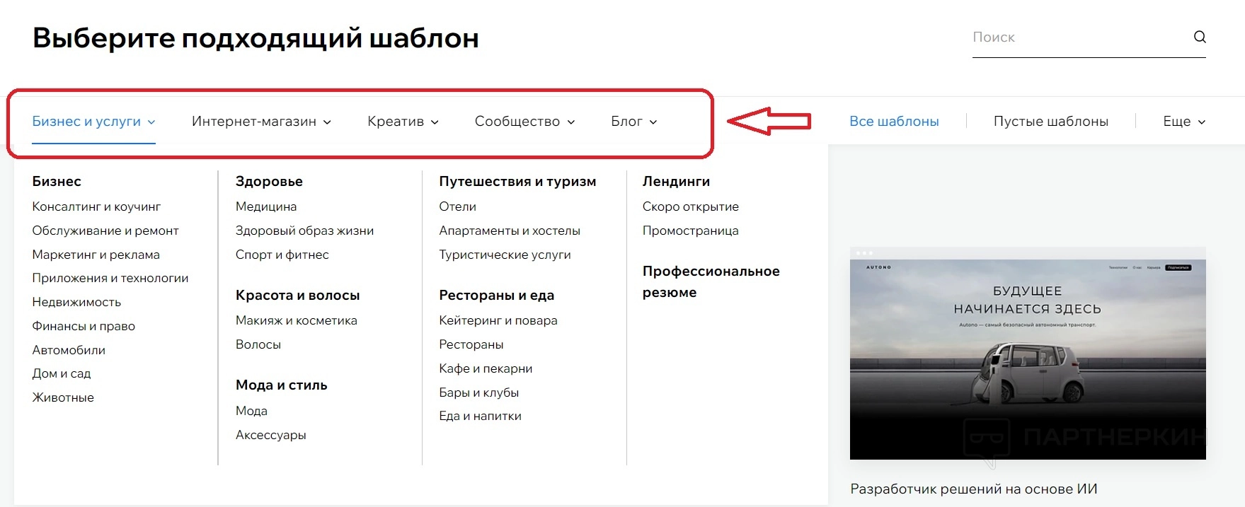 - Выбрать тип сайта — блог, магазин, сайт мероприятия, лендинг.