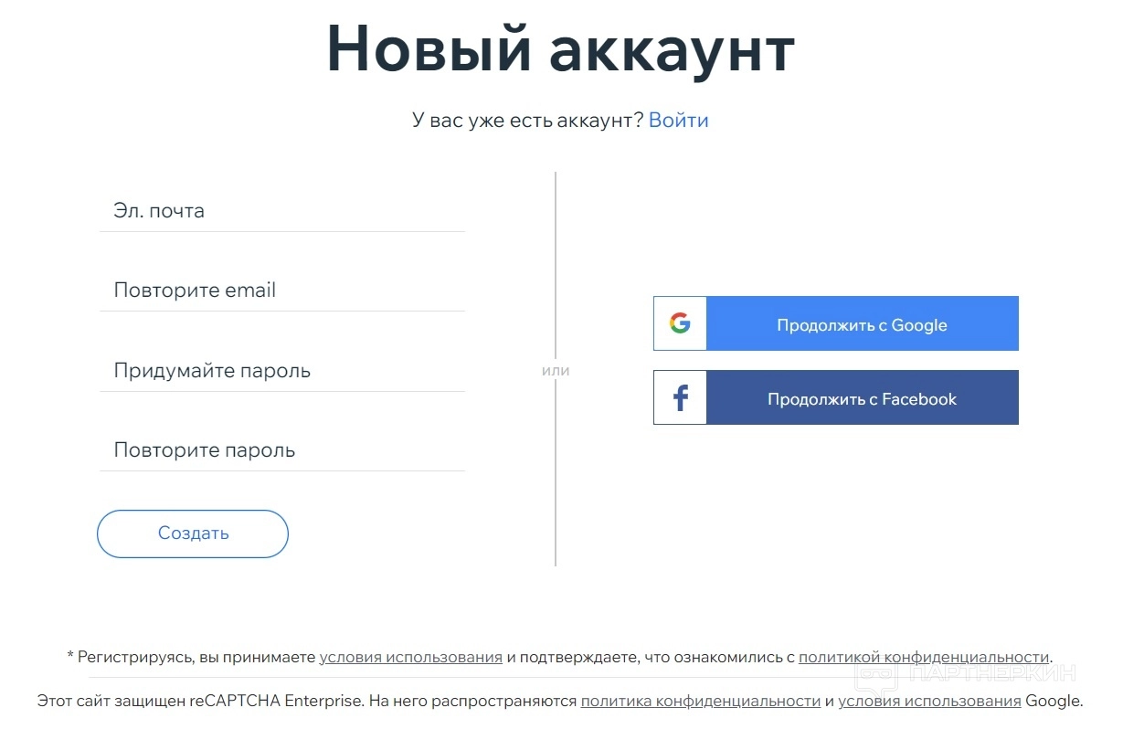 Для регистрации понадобится электронная почта и надежный пароль. Можно авторизоваться через Google или Facebook*-аккаунт. Не требуется вводить номер телефона и данные кредитной карты: большая часть опций Wix будет доступна сразу. В том числе можно приступить к созданию первого бесплатного сайта на платформе.