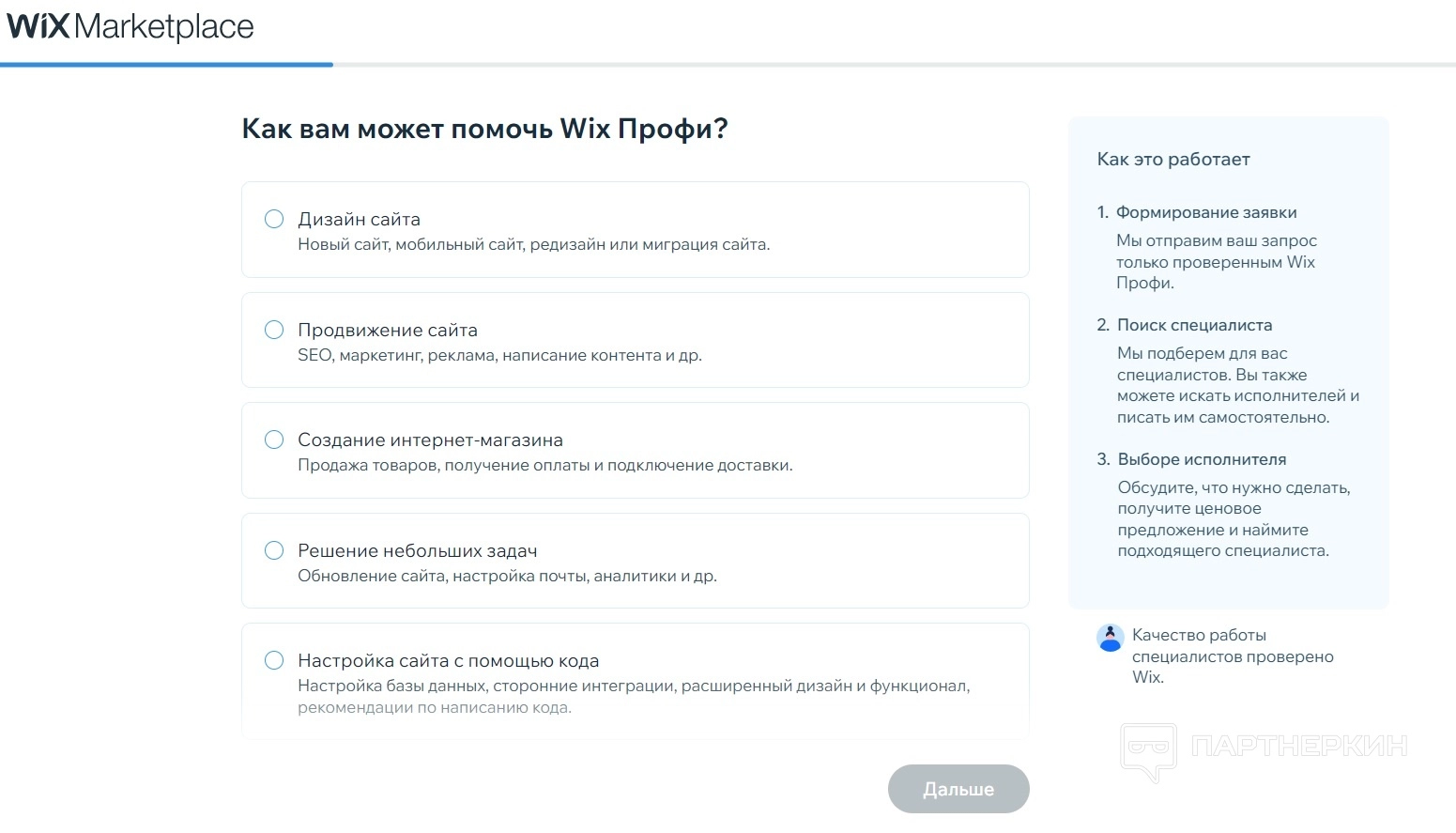 Клиент может ответить на вопросы предложенной анкеты, чтобы Wix дал подборку подходящих исполнителей, без необходимости просматривать весь каталог. Как заказать услугу: