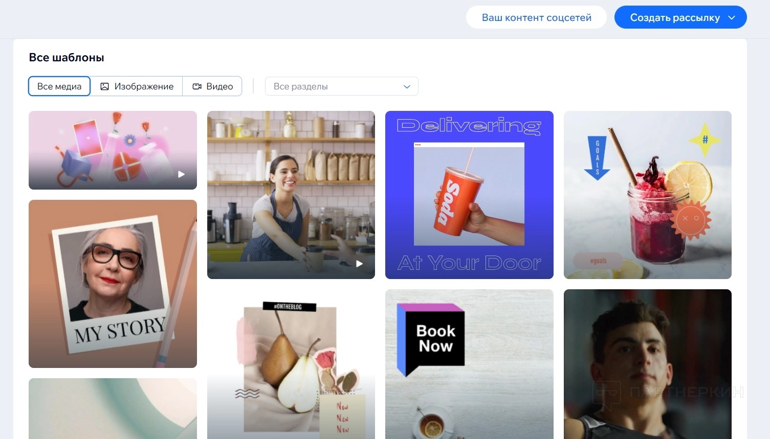- Медиа . Это проводник с загруженными файлами — видео, фото. Можно добавлять контент с ПК, из соцсетей, с Google Диска.